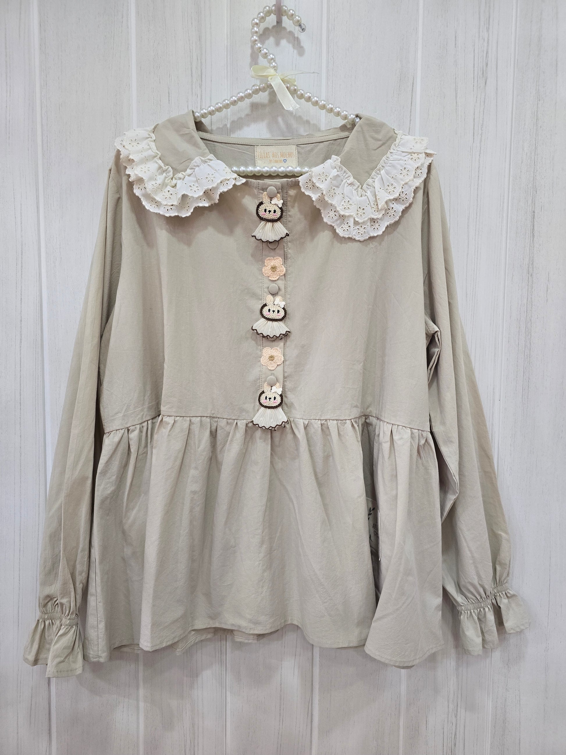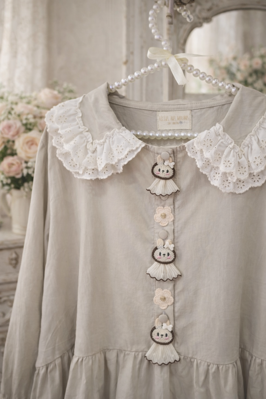 Túnica Creme Coelhinas e Flores Gola Bordado Inglês